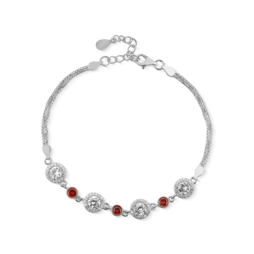 VLASTNOSTI Typ náramku: řetízkové Délka náramku: 18 cm Materiál: rhodiované stříbro Barva: červená Barva: čirá Barva: stříbrná Ryzost: Ag 925/1000 Osazení: zirkon Povrchová úprava: bez povrchové úpravy