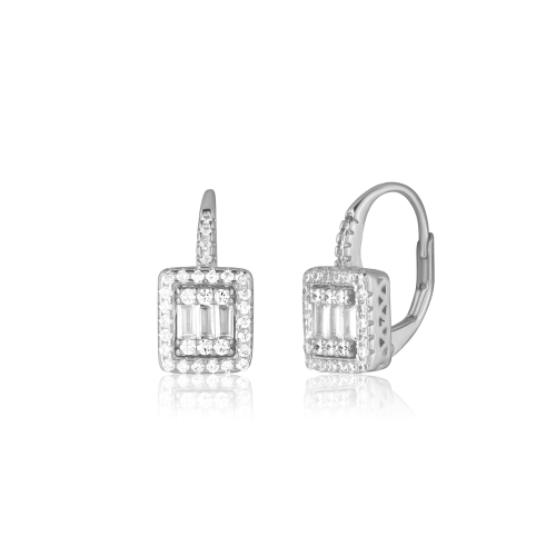 VLASTNOSTI Typ náušnic: klasické Materiál: rhodiované stříbro Barva: stříbrná Barva: čirá Ryzost: Ag 925/1000 Typ zapínání náušnic: klapka Osazení: zirkon Povrchová úprava: bez povrchové úpravy šířka: 8 mm výška: 16 mm hloubka: 8 mm
