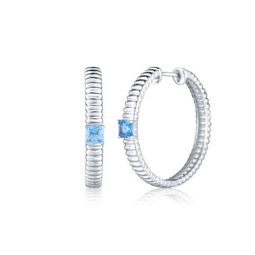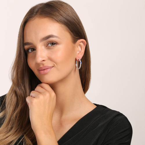 VLASTNOSTI Typ náušnic: kruhy Materiál: rhodiované stříbro Barva: modrá Barva: stříbrná Ryzost: Ag 925/1000 Typ zapínání náušnic: francouzské zapínání Osazení: zirkon Povrchová úprava: bez povrchové úpravy šířka: 4 mm výška: 29 mm hloubka: 32 mm