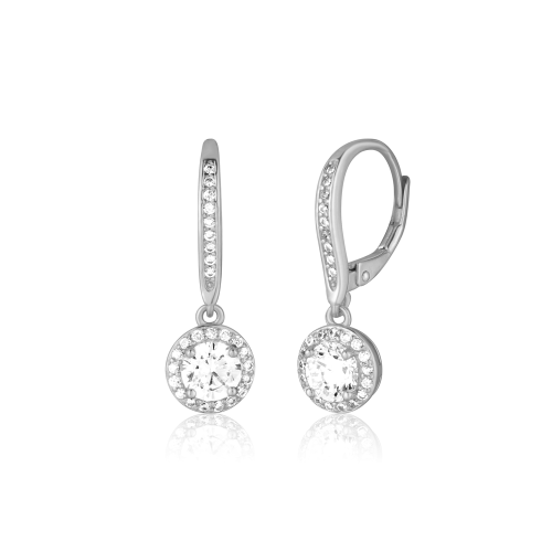 VLASTNOSTI Typ náušnic: visací Barva: čirá Barva: stříbrná Materiál: rhodiované stříbro Ryzost: Ag 925/1000 Typ zapínání náušnic: klapka Osazení: zirkon Povrchová úprava: bez povrchové úpravy šířka: 8 mm výška: 23 mm hloubka: 13 mm