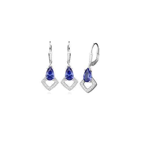 VLASTNOSTI Typ náušnic: visací Materiál: rhodiované stříbro Barva: stříbrná Barva: modrá Barva: čirá Ryzost: Ag 925/1000 Typ zapínání náušnic: klapka Osazení: zirkon Povrchová úprava: bez povrchové úpravy šířka: 10 mm výška: 28 mm hloubka: 9.5 mm