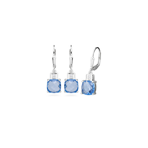 VLASTNOSTI Typ náušnic: visací Materiál: rhodiované stříbro Barva: stříbrná Barva: modrá Barva: čirá Ryzost: Ag 925/1000 Typ zapínání náušnic: klapka Osazení: zirkon Povrchová úprava: bez povrchové úpravy šířka: 8 mm výška: 28 mm hloubka: 9 mm