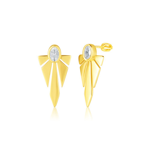 VLASTNOSTI Typ náušnic: visací Typ náušnic: klasické Barva: žluté zlacení Barva: čirá Materiál: rhodiované stříbro Ryzost: Ag 925/1000 Typ zapínání náušnic: šroubek Osazení: zirkon Povrchová úprava: IPGold šířka: 14 mm výška: 26 mm hloubka: 16 mm