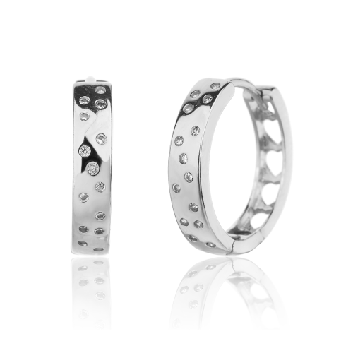 VLASTNOSTI Typ náušnic: kruhy Materiál: rhodiované stříbro Barva: stříbrná Barva: čirá Ryzost: Ag 925/1000 Motiv: srdce Typ zapínání náušnic: kloub - kruhy Osazení: zirkon Povrchová úprava: bez povrchové úpravy šířka: 3 mm výška: 17 mm hloubka: 17 mm