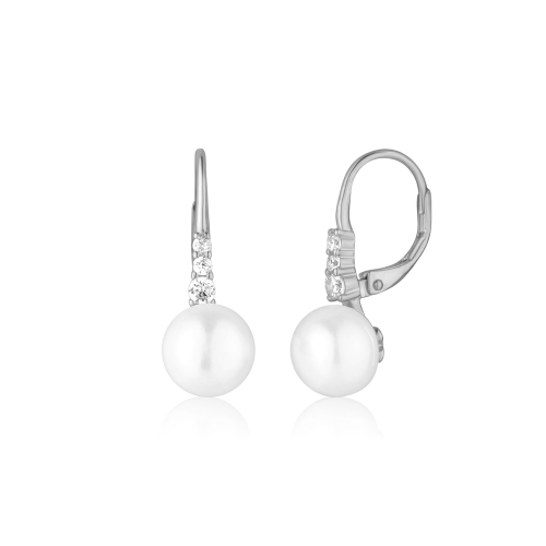 VLASTNOSTI Typ náušnic: klasické Barva: stříbrná Barva: čirá Barva: bílá Materiál: rhodiované stříbro Ryzost: Ag 925/1000 Typ zapínání náušnic: klapka Osazení: zirkon Osazení: perla Povrchová úprava: bez povrchové úpravy šířka: 8 mm výška: 24 mm hloubka: 16 mm