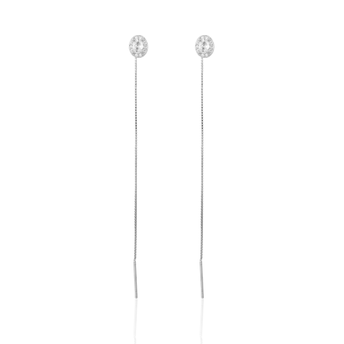 VLASTNOSTI Typ náušnic: visací Barva: čirá Barva: stříbrná Materiál: rhodiované stříbro Ryzost: Ag 925/1000 Typ zapínání náušnic: provlékací Osazení: zirkon Povrchová úprava: bez povrchové úpravy šířka: 5 mm výška: 80 mm hloubka: 13 mm
