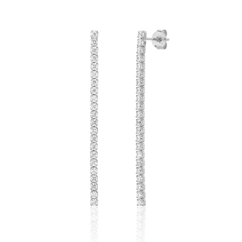 VLASTNOSTI Typ náušnic: visací Materiál: rhodiované stříbro Barva: čirá Barva: stříbrná Ryzost: Ag 925/1000 Typ zapínání náušnic: puzeta Osazení: zirkon Povrchová úprava: bez povrchové úpravy šířka: 2 mm výška: 40 mm hloubka: 12 mm