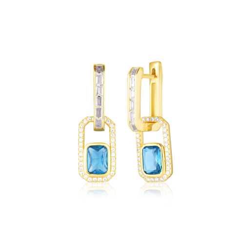 VLASTNOSTI Typ náušnic: visací Materiál: rhodiované stříbro Barva: žluté zlacení Barva: modrá Barva: čirá Ryzost: Ag 925/1000 Typ zapínání náušnic: francouzské zapínání Osazení: zirkon Povrchová úprava: IPGold šířka: 9 mm výška: 29 mm hloubka: 11 mm