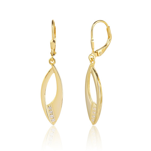 VLASTNOSTI Typ náušnic: visací Materiál: rhodiované stříbro Barva: žluté zlacení Barva: čirá Ryzost: Ag 925/1000 Typ zapínání náušnic: klapka Osazení: zirkon Povrchová úprava: IPGold šířka: 9 mm výška: 39 mm hloubka: 11 mm