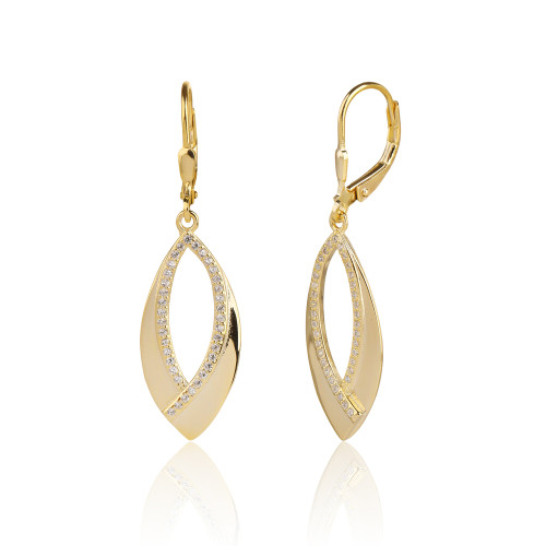 VLASTNOSTI Typ náušnic: visací Barva: čirá Barva: žluté zlacení Materiál: rhodiované stříbro Ryzost: Ag 925/1000 Typ zapínání náušnic: klapka Osazení: zirkon Povrchová úprava: IPGold šířka: 12 mm výška: 41 mm hloubka: 11 mm