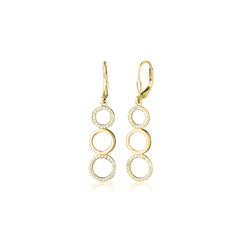VLASTNOSTI Typ náušnic: visací Materiál: rhodiované stříbro Barva: čirá Barva: žluté zlacení Ryzost: Ag 925/1000 Typ zapínání náušnic: klapka Osazení: zirkon Povrchová úprava: IPGold šířka: 10 mm výška: 43 mm hloubka: 9 mm