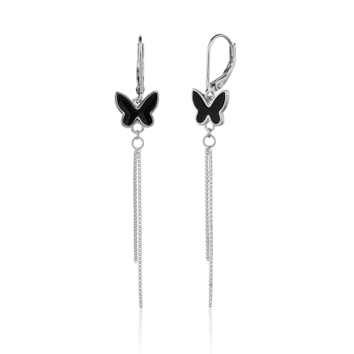 VLASTNOSTI Typ náušnic: visací Materiál: rhodiované stříbro Barva: stříbrná Barva: černá Ryzost: Ag 925/1000 Typ zapínání náušnic: klapka Motiv: zvíře Osazení: smalt Povrchová úprava: bez povrchové úpravy šířka: 10 mm výška: 62 mm hloubka: 12 mm