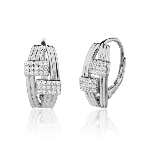VLASTNOSTI Typ náušnic: klasické Materiál: rhodiované stříbro Barva: stříbrná Barva: čirá Ryzost: Ag 925/1000 Typ zapínání náušnic: klapka Osazení: zirkon Povrchová úprava: bez povrchové úpravy šířka: 9 mm výška: 17 mm hloubka: 11 mm