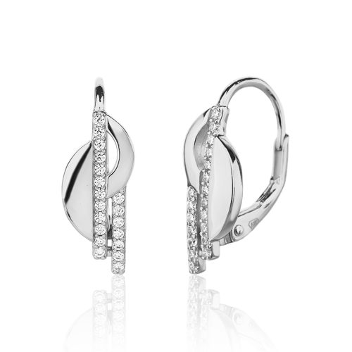 VLASTNOSTI Typ náušnic: klasické Barva: čirá Barva: stříbrná Materiál: rhodiované stříbro Ryzost: Ag 925/1000 Typ zapínání náušnic: klapka Osazení: zirkon Povrchová úprava: bez povrchové úpravy šířka: 7 mm výška: 19 mm hloubka: 12 mm