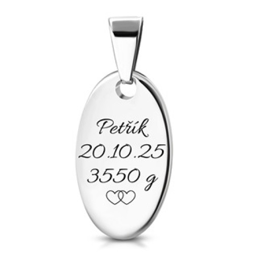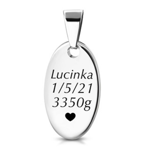 Drobný oválný přívěsek s s rytinu vašehovlastního textu. Šperk je vyrobený z jakostní nerezové oceli 316L a má leštěný povrch. Přívěsek může být skvělým osobním dárkem pro Vaši manželku, partnerku, maminku, nebo kamarádku k narozeninám, Vánocům nebo jako připomínka mimořádné události či osobním vzkazem milované osobě!
