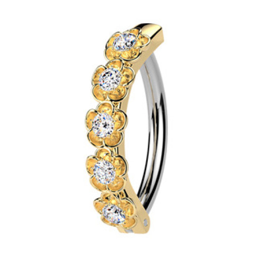 Nudí-li Vás již klasické pupíkovky, pak věříme, že Vás zaujme tento nový typ piercingu do pupíku se štítem dekorovaným drobnými kytičkami