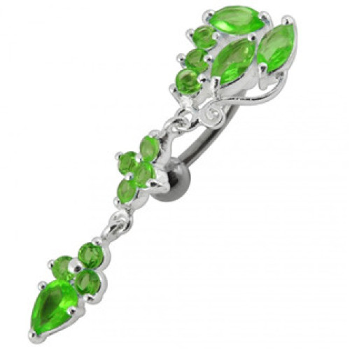 Stříbrný piercing do pupíku, světle zelené zirkony