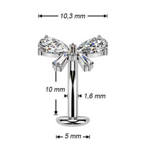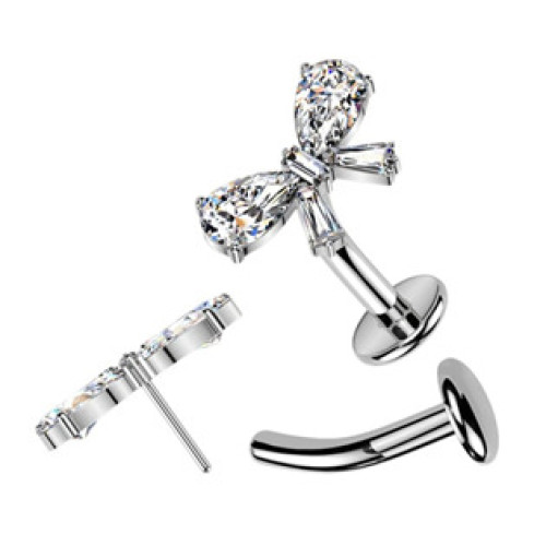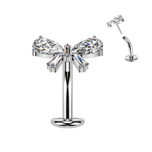 Obrácený PUSH IN piercing do pupíku dekorovaný motivem mašličky osazené zirkony čiré barvy
