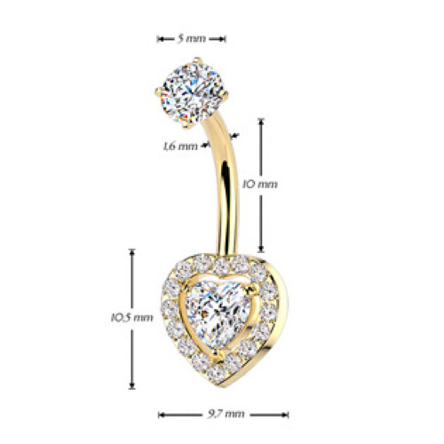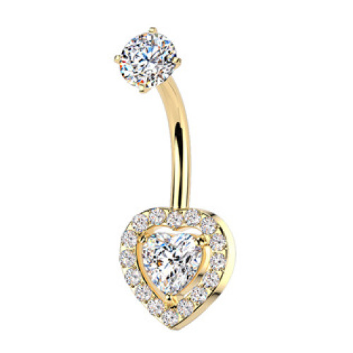 Zlacený piercing do pupíku s ozdobnou částí ve tvaru srdíčka dekorovaného zirkony