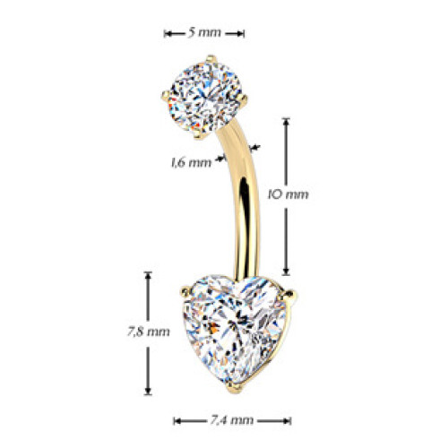 Zlacený piercing do pupíku s ozdobnou částí ve tvaru srdíčka