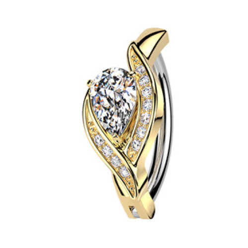 Tyčka tohoto piercingu je vyrobena z jakostní nerezové oceli a ozdobný štít je z nezávadné bižuterie se zlaceným povrchem