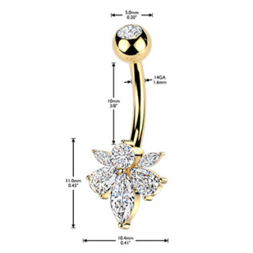 Tyčka a vrchní kulička piercingu jsou vyrobeny z kvalitní chirurgické oceli 316L a ostatní ozdobné části z nezávadné bižuterie s povrchovou úpravou v barvě žlutého zlata