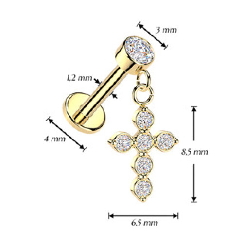 Zlacený piercing do ucha - labreta s křížkem, 1,2 x 6 mm