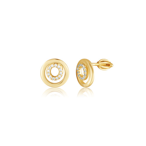 VLASTNOSTI Typ náušnic: pecky Barva: žluté zlacení Barva: čirá Materiál: rhodiované stříbro Ryzost: Ag 925/1000 Typ zapínání náušnic: šroubek Osazení: zirkon Povrchová úprava: IPGold šířka: 10 mm výška: 10 mm hloubka: 16 mm