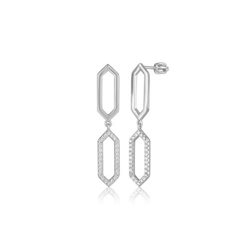 VLASTNOSTI Typ náušnic: visací Materiál: rhodiované stříbro Barva: čirá Barva: stříbrná Ryzost: Ag 925/1000 Typ zapínání náušnic: šroubek Osazení: zirkon Povrchová úprava: bez povrchové úpravy šířka: 7 mm výška: 40 mm hloubka: 13 mm