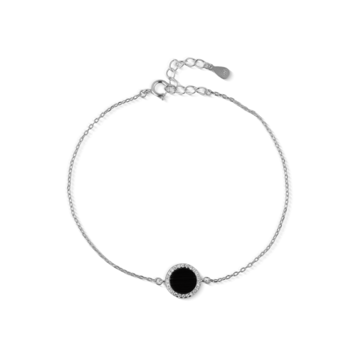 VLASTNOSTI Typ náramku: řetízkové Délka náramku: 18 cm Barva: černá Barva: čirá Barva: stříbrná Materiál: rhodiované stříbro Ryzost: Ag 925/1000 Osazení: zirkon Osazení: Syntetický malachyt Povrchová úprava: bez povrchové úpravy