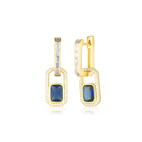 VLASTNOSTI Typ náušnic: visací Materiál: rhodiované stříbro Barva: žluté zlacení Barva: modrá Barva: čirá Ryzost: Ag 925/1000 Typ zapínání náušnic: francouzské zapínání Osazení: zirkon Povrchová úprava: IPGold šířka: 9 mm výška: 29 mm hloubka: 11 mm