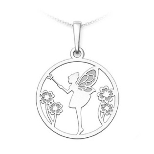 Jemný stříbrný přívěsek s motivem víly zaujme romantickým a hravým designem. Silueta víly s křídly je zasazena do kulatého rámu a doplněna jemnými květinovými motivy, které šperku dodávají pohádkovou atmosféru a lehkost.