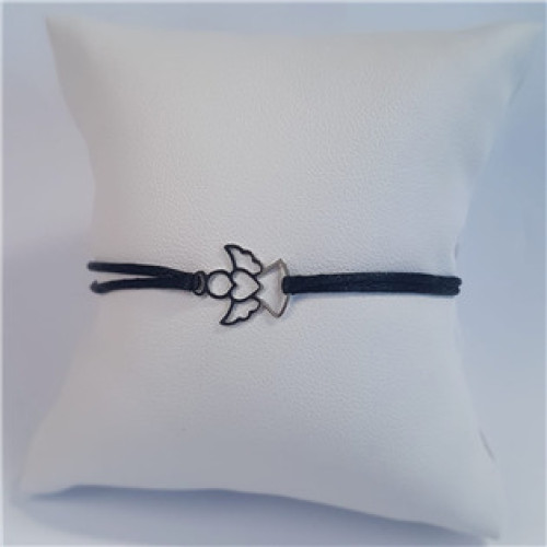 Textilní náramek dekorovaný stříbrnou destičkou ve tvaru andělíčka