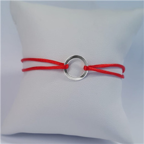 Červený textilní náramek dekorovaný kulatou stříbrnou destičkou