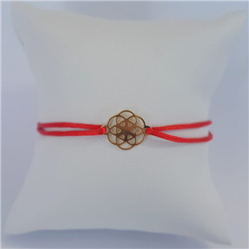 Červený textilní náramek dekorovaný stříbrnou destičkou s motivem květ života