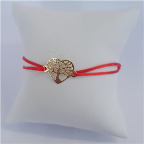 Červený textilní náramek dekorovaný stříbrnou destičkou ve tvaru srdce a motivem strom života